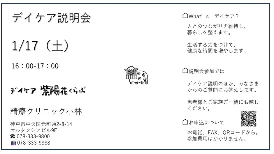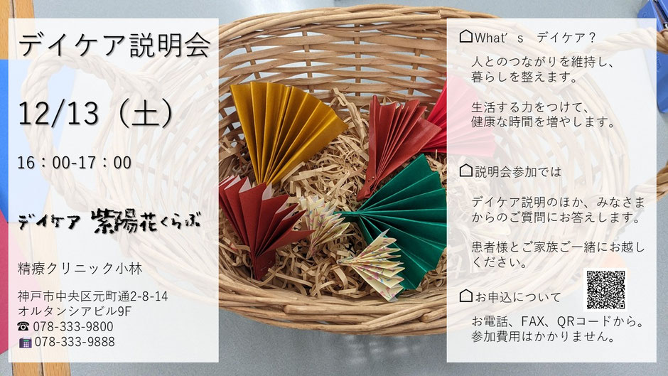 078-333-9800(受付)におかけいただき、「デイケア説明会を申し込みたい」とお伝えください。お電話がつながるのは診療日の9時~18時までです。