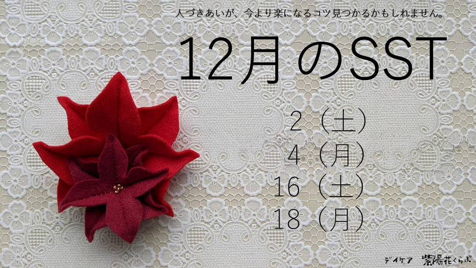 今日のデイケア · 2023/12/16 SST 今日のSSTは課題決めの日。みなさんの対人関係上の困っていることを紙に書き出し、順番にお一人ずつ対策を考えていきます。今日も非常に多くの方に参加いただきました。次回は18(月)に開催します。 tagPlaceholderカテゴリ: