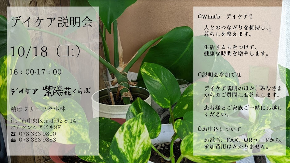 これからデイケアの利用をお考えの方へ。当院では毎月第2(土)にデイケア説明会を開催しています。本日お越しになったみなさま、ありがとうございました。来月は10/18(土)に開催します。お申込は、メールフォーム、FAX、お電話にてお待ちしております。