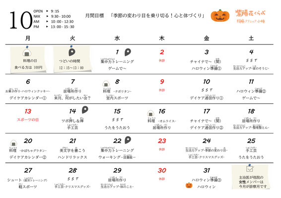 今日のデイケア · 2025/09/19 10月予定表 デイケア紫陽花くらぶ、10月カレンダーができました。月間目標は、「季節の変わり目を乗り切る!心と体づくり」です。お家の中の衣替え、動いて体も衣替え、気づけば心も衣替え。おっと、衣替えって言い過ぎました。それはさておき、デイケアを使って季節の変わり目をスムーズに乗り越えましょう。 tagPlaceholderカテゴリ: