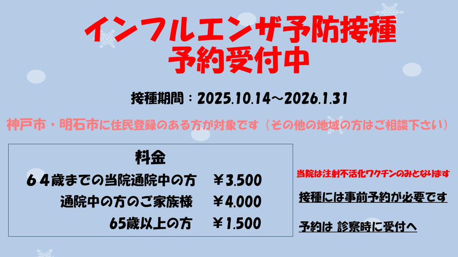スタッフより · 2025/10/14 予防接種 スタッフからのお知らせです。インフルエンザの予防接種を受付しています。10月なのにまだ暑いし、10月なのにもうインフルエンザが流行ってる。なんてこった。とにかく体調管理に気をつけなくちゃいけません。お申込は受付までお願いします。 tagPlaceholderカテゴリ: