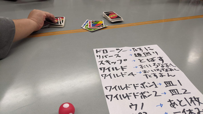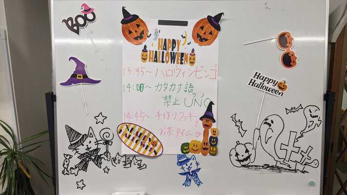 今日は10/31。世間はハロウィン。おばけたち…いやデイケアメンバーたちは朝からせっせと働いています。お菓子を焼いて、部屋をかざりつけ。こんな働きおばけ…いやメンバーは他にいるのでしょうか。おばけ…いやメンバーたちが企画、進行したゲームがすごく盛り上がりました。1つめはハロウィンにちなんだ言葉でビンゴ。(ぼやき:デイケアスタッフYは一番にビンゴになったのに、もらえる景品は何位でも同じだったんですけど。)2つめのカタカナ禁止ウノでは、カタカナをしゃべっちゃうごとに2枚カードが追加されてしまいます。(ぼやき②:デイケアスタッフYはカタカナポリスたちに厳しく取り締まられて、最終15枚になったんですけど。)ここのおばけたち、人を楽しませるのはどうやら得意なようです。(ぼやき③:デイケアスタッフYはこのウノ以来、いまだにカタカナしゃべるとドキッとするんですけど。これもハロ…いや、日本語で言うところの万聖節前夜祭のしわざですか…。)