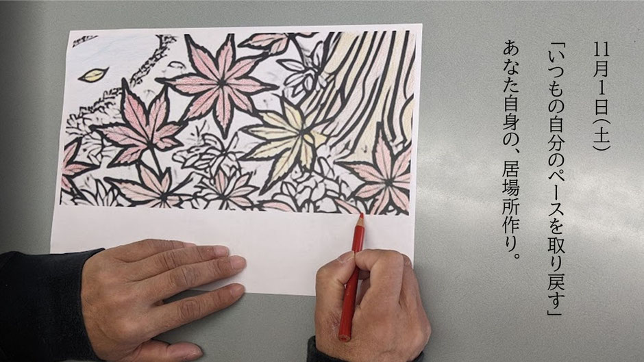 「いつもの自分のペースを取り戻したい」そんなあなたにおすすめするのが、居場所作りの時間。病気の時間を短くして、いつものあなたらしい過ごし方に戻してください。今日はゆっくり過ごしていた方の作品を紹介します。9枚のぬりえを手分けして色づけし、最後に合わせてみるとすてきな紅葉風景が出来上がりました。あたたかみのある色をつけたメンバーたちは、心もずっとあったかいのです。さて、月曜は祝日のためお休みです。ともかく自分のペースを第一に。また火曜日にお待ちしていますね。