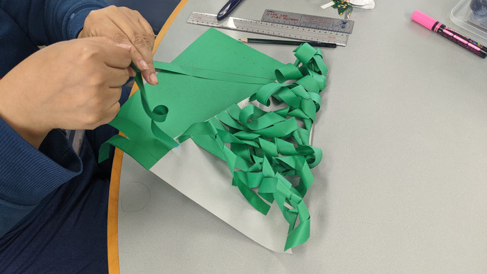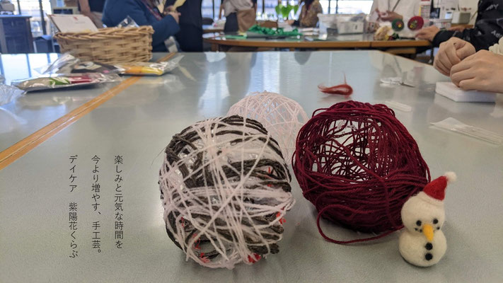 「元気でいる時間がほしい」「楽しみを増やしたい」 こんな思いがあるあなたには「手工芸」の時間がぴったりです。一人でコツコツ、だれかとおしゃべりしながら、クリスマスグッズを作りました。あなたの病気の時間を少し短くして、健康でいる時間をのばしていきましょう。明日のデイケアは料理とカラオケ。料理はさつまいも入り豚汁です。みそ汁にさつまいもが入るのはちょっと苦手なメンバー1名、スタッフ1名…。いも減らし気味でお願いします。