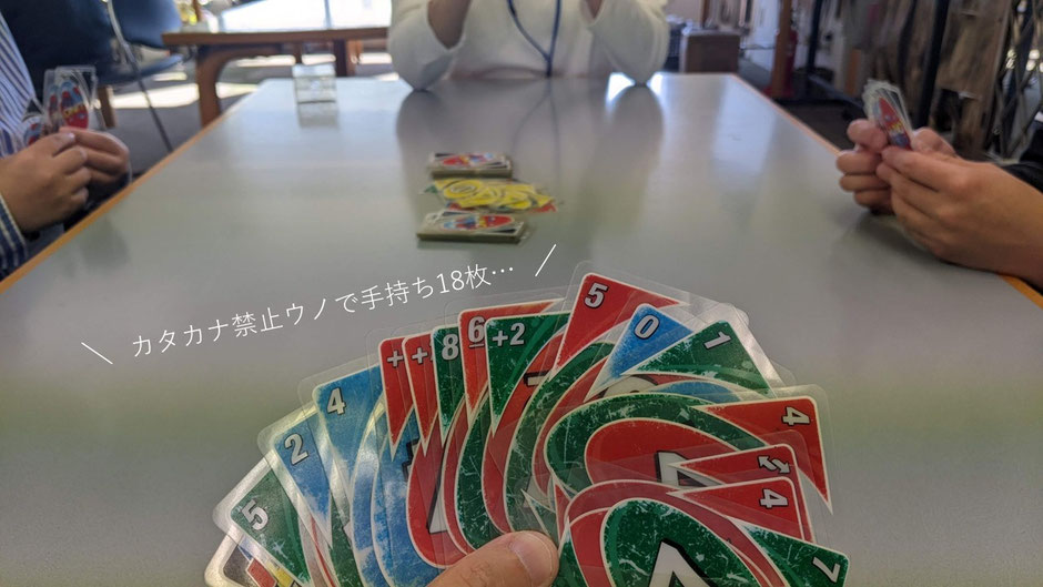 今日のデイケア · 2025/11/08 日本語のみ 「最近笑うことが減ってきた…」「もっと元気がほしい」そんな方にはゲームで~がぴったりです。笑うことはストレスの軽減につながりますし、何より病気の時間を短くしてくれます。今日も麻雀やオセロ、ウノでわいわい楽しい時間を過ごしました。ウノはカタカナ禁止で言ってしまったら2枚追加されるという厳しいルール。写真を見てください。カタカナポリスたちに取り締まられて18枚も持ってしまった精神保健福祉士の手札を…。それに対して取り締まるポリスたちの嬉しそうな顔ったら…キィー、く、くやしい…。 tagPlaceholderカテゴリ:
