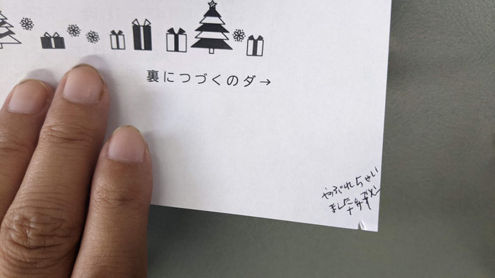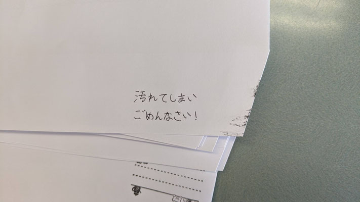 「働く力をつけたい」そんなあなたには、デイケアの就労トレーニング(省略してシュート)がぴったりです。シュートでは月に1回、他機関宛てに送る書類の封入作業をしています。切手を貼ったりやわらかい紙を封筒に入れたり、こんな緊張感を味わいたくないでしょうけど味わえます。今回はコピー機による紙の切れやインクの汚れがあり、メンバーがお詫びのメッセージを書きました。印刷のし直しも考えたのですが、こういうほうがメンバーらしくっていい。さて、明日のデイケアは午前が集中力トレーニング(一定時間座っている)、午後は生活力アップ(インフルエンザなどの対策)。明日もお待ちしています。