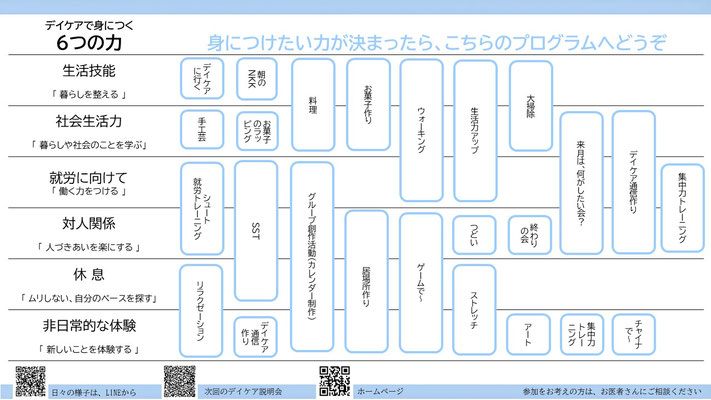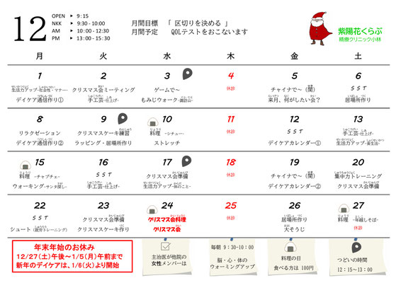 12月のデイケア予定表ができました。今年最後の目標は「区切りをつける」やり残したこともあるかもしれませんが、「いつまでにするか」という区切りを決めてみてください。すると、「そこまでにやりとげる」というモチベーションが出るかもしれません。もしくは、「これ以上はもうしない」と決めた心の重荷が減るかもしれません。12月は区切りのことを考えやすい月。デイケアでやり残したことに、あなたはどんな区切りをつけますか?