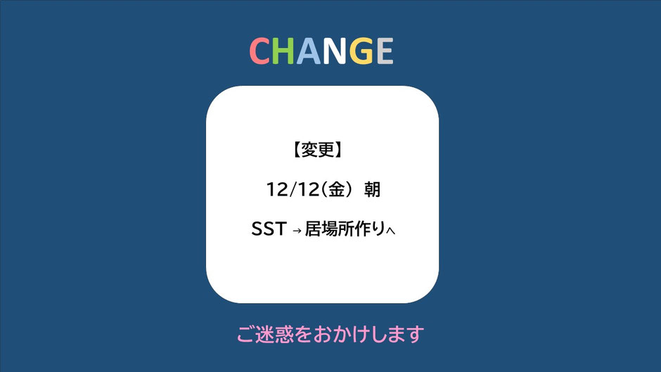 SST · 2025/12/10 【変更】 【12/10 変更のお知らせ】12/12(金)に予定していたSSTですが、居場所作りに変更となります。スタッフ都合によるためです。大変申し訳ありません。次回は10/16(火)に行います。 tagPlaceholderカテゴリ: